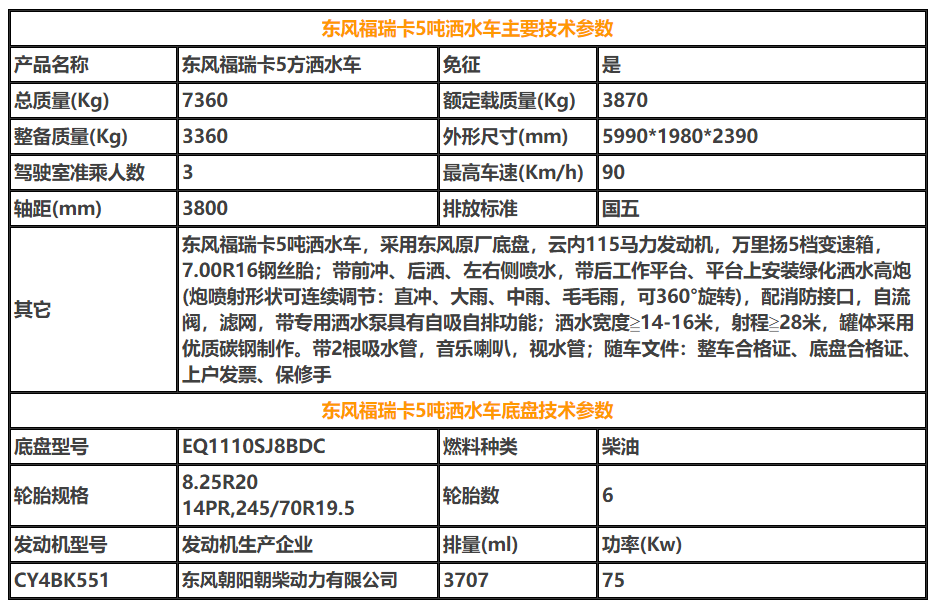 國六東風小福瑞卡 5噸 灑水車 核心參數項目參數軸距(mm)3308…