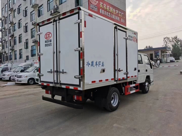 江鈴順達雙排冷藏車,整車型號:AAA5043XLCJX6,整車尺寸:5995×1980×2900,廂體尺寸:3250×1800×1800,五十鈴115馬力發動機,5檔變速箱,原廠空調,助力,ABS,油剎,軸距3360,7.00R16LT 8PR輪胎,廂體采用內外玻璃鋼、中間8CM 厚聚氨酯保溫板、底板為防滑花紋鋁板,單開側門,不銹鋼門鎖件,-15度制冷機組,其余標配。